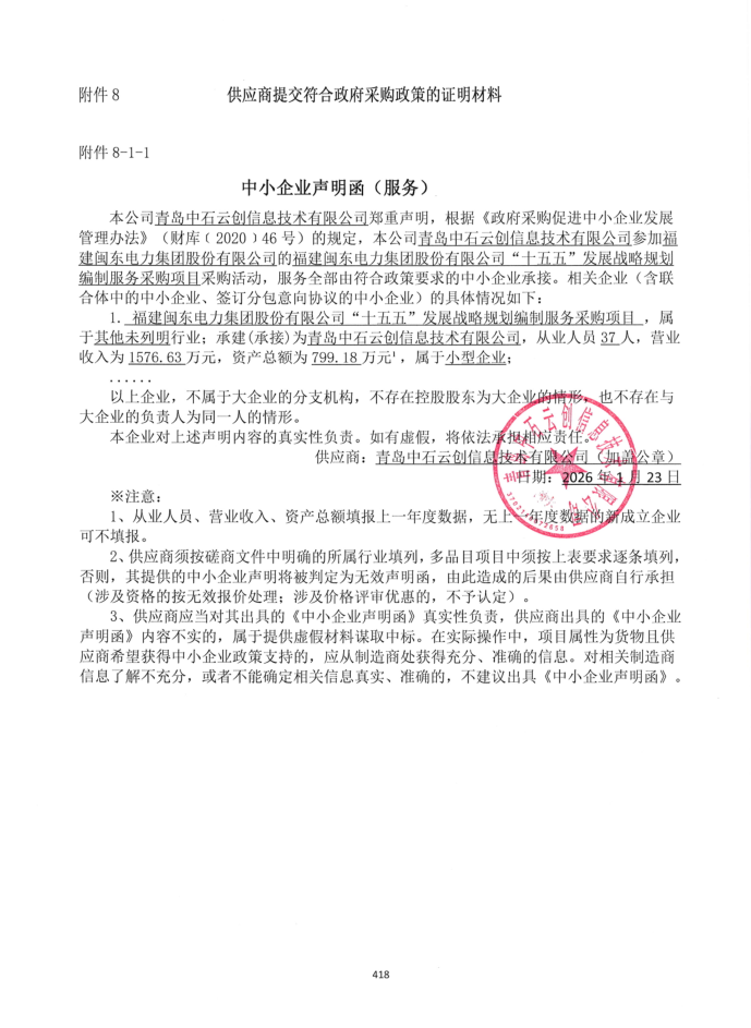 1 | 青岛中石云创信息技术有限公司 | 福建闽东电力集团股份有限公司“十五五”发展战略规划编制服务采购项目 | 福建闽东电力集团股份有限公司“十五五”发展战略规划编制服务采购项目 | 根据闽东电力“十四五”发展战略规划制定的主要任务完成情况进行总结等,具体详见成交供应商响应文件 | 2026年5月31日前通过采购人组织的评审并提供正式报告,具体按磋商文件要求的时间节点执行 | 成果以电子版和纸质文本两种形式交付等,具体详见成交供应商响应文件 |
