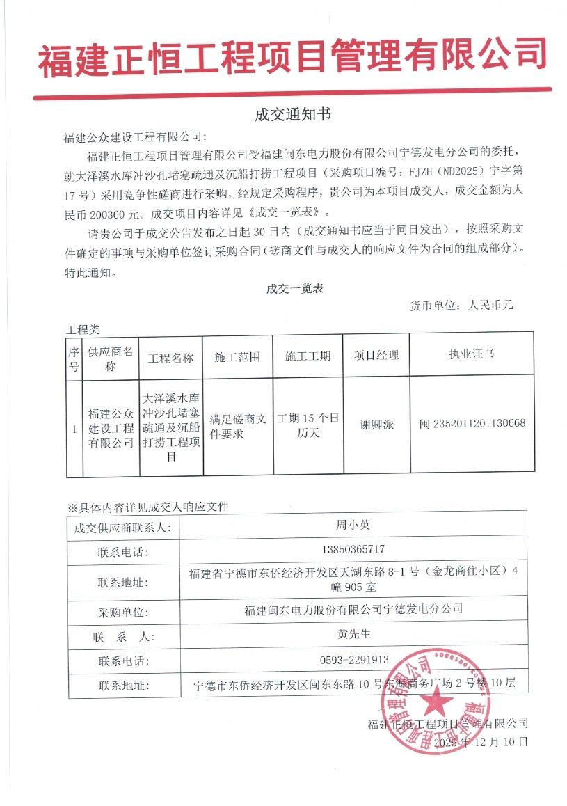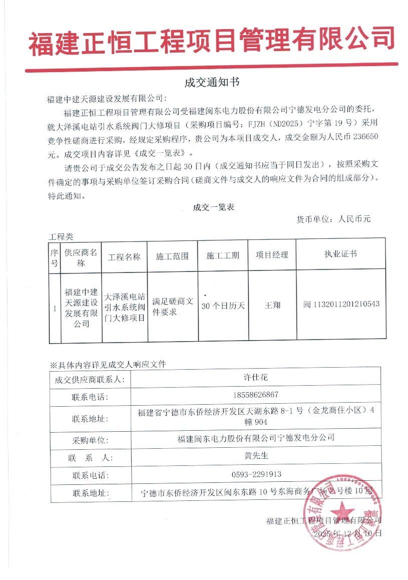 大泽溪电站引水系统阀门大修等项目成交通知书