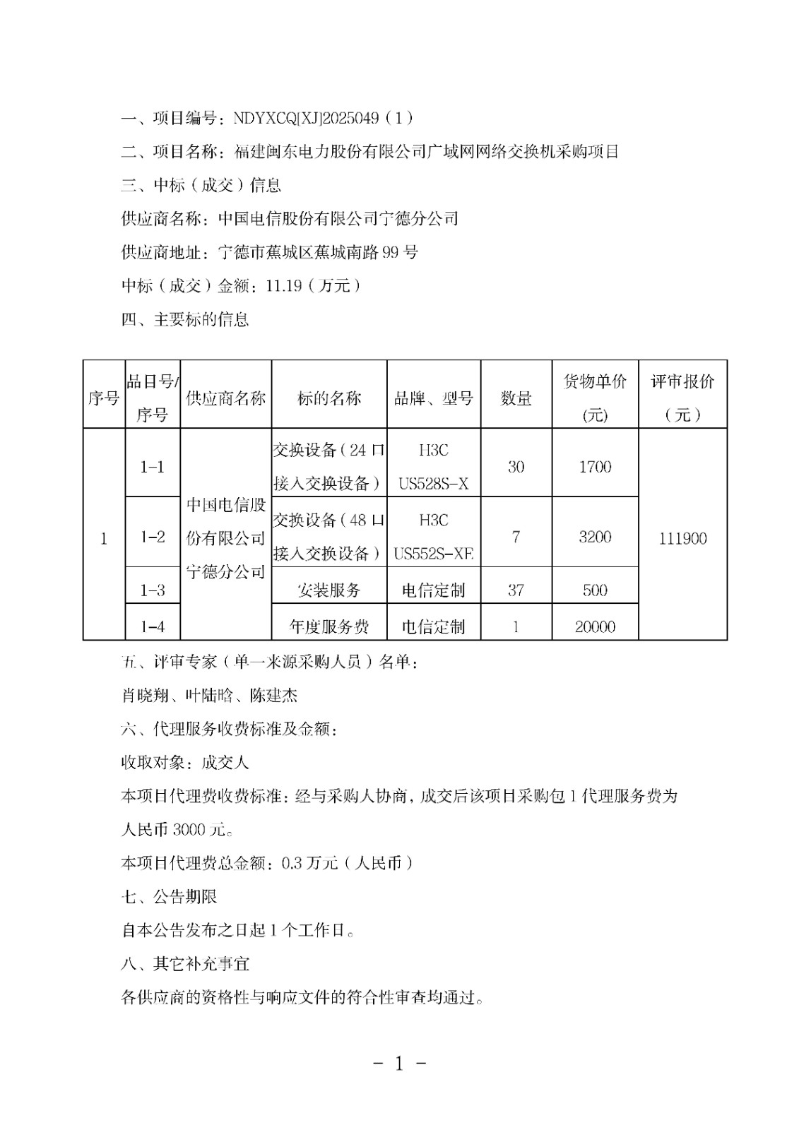 福建闽东电力股份有限公司关于福建闽东电力股份有限公司广域网网络交换机采购项目询价采购成交公告