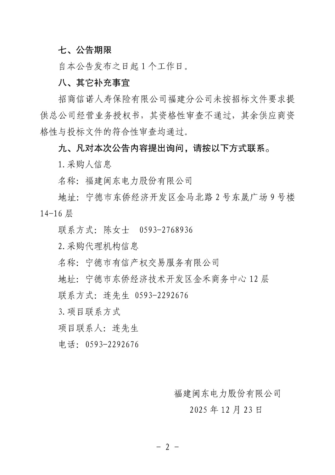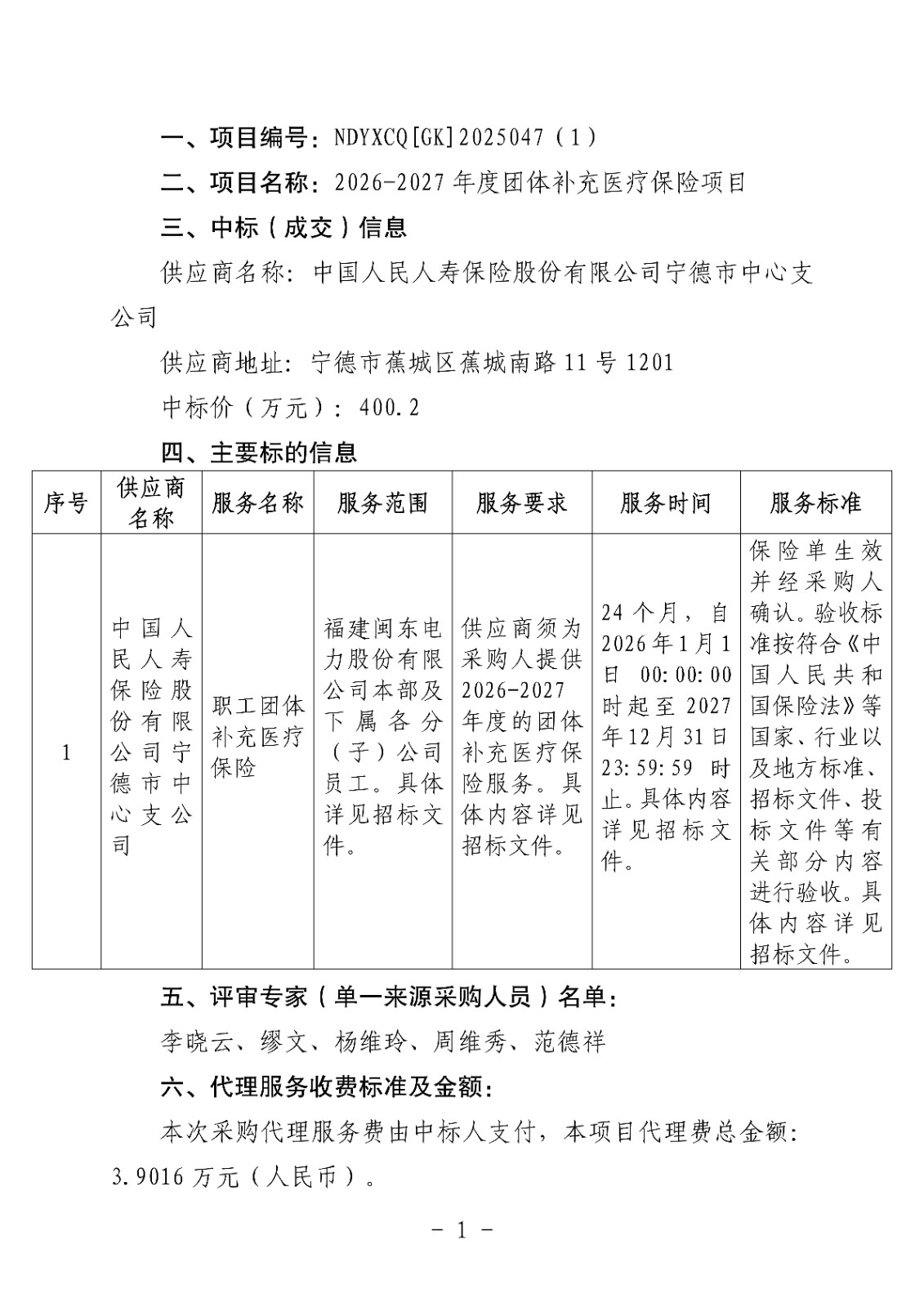 福建闽东电力股份有限公司关于2026-2027年度团体补充医疗保险项目公开招标中标公告