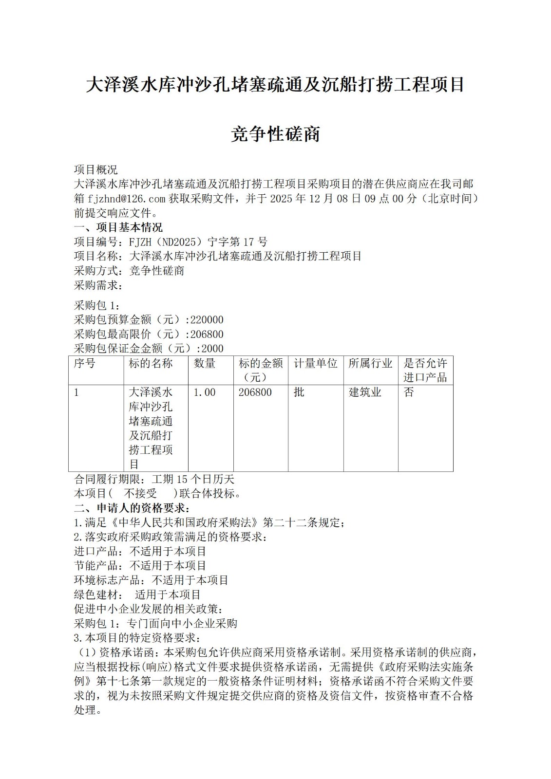 大泽溪水库冲沙孔堵塞疏通及沉船打捞工程项目竞争性磋商